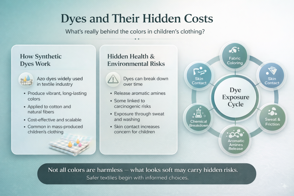 Color is one of the most underexamined factors in children’s clothing purchases. A soft blue onesie or a pastel-striped set looks gentle, harmless, even calming. But the pigments that produce those colors are among the most problematic substances in conventional textile production.