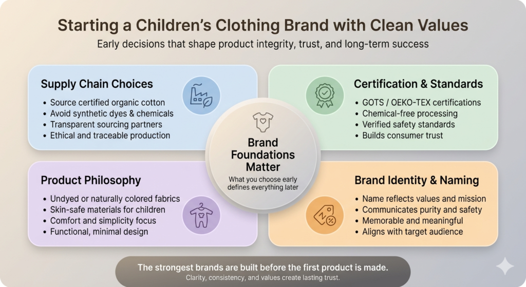 If you’re considering entering this space as an entrepreneur — maybe you’ve struggled to find truly clean, undyed organic cotton clothing for your own children and see the gap in the market — the first decisions you’ll make are also the most consequential. Your supply chain, your certification approach, your sizing philosophy, your commitment to chemical-free processing: these define the product before a single piece goes on sale.